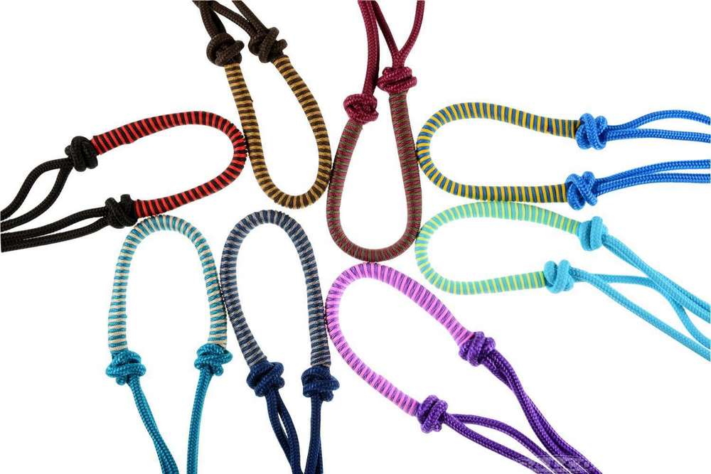 Bandaged halter for horse is a recommended product for horse training. Made of UV-stable, high-tensile, high-quality rope that has a 450 kg breaking point. Instead of a loop, a metal ring is used to secure the halter. It can be adjusted at small intervals, making sure the knots are in the correct position. Not suitable for tying up the animal. Available in the combination of 2 bright colour.